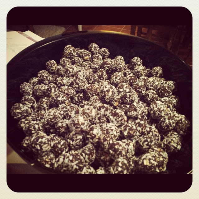 2 kg dadler, 1/2 kg havregryn og en masse kakao og kokos bliver til 400 lækre havregrynskugler, der sammen med en madplan bliver delt ud, når jeg står ved forlagets stand i Bella Centeret.